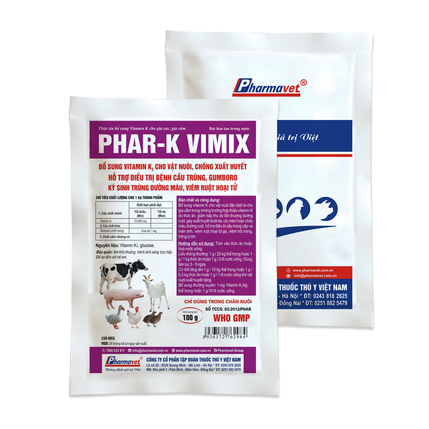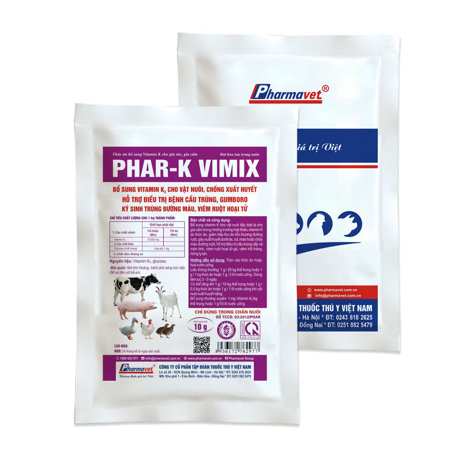 Supplementing vitamin K for animals, especially poultry, in cases of vitamin K deficiency due to food, reduced absorption due to intestinal damage, causing bleeding under the skin, muscles, crest or intestinal bleeding, supporting Treatment of acute and chronic coccidiosis, chicken necrotic enteritis, ileitis, and swine dysentery.