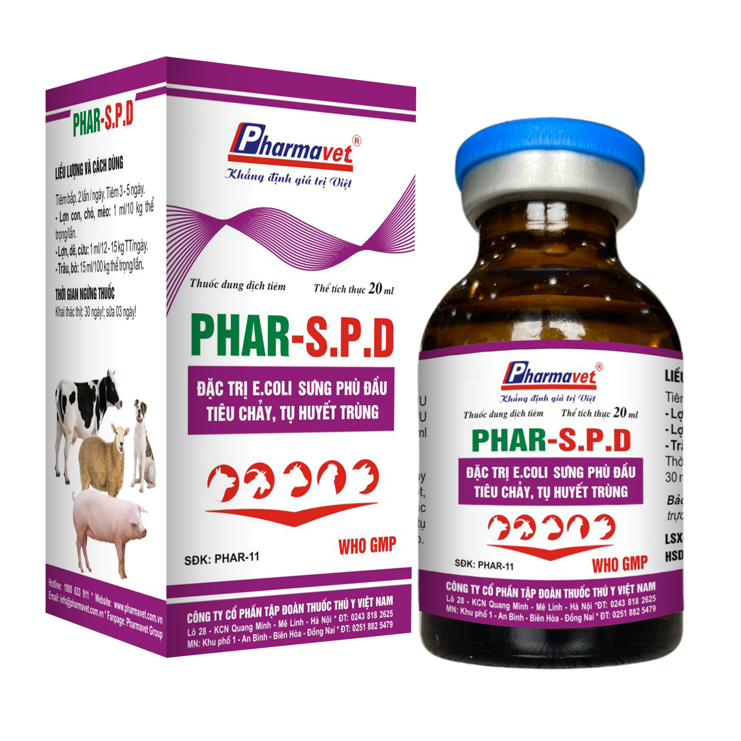 Đặc trị phù đầu lợn con. Bệnh tiêu chảy phân trắng, phân xanh, viêm dạ dày, ruột, phó thương hàn, viêm vú, viêm tử cung, đặc biệt bệnh tụ huyết trùng trâu bò, nhiễm tụ cầu. E.coli, kiết lỵ, viêm mũi xoang chó mèo.