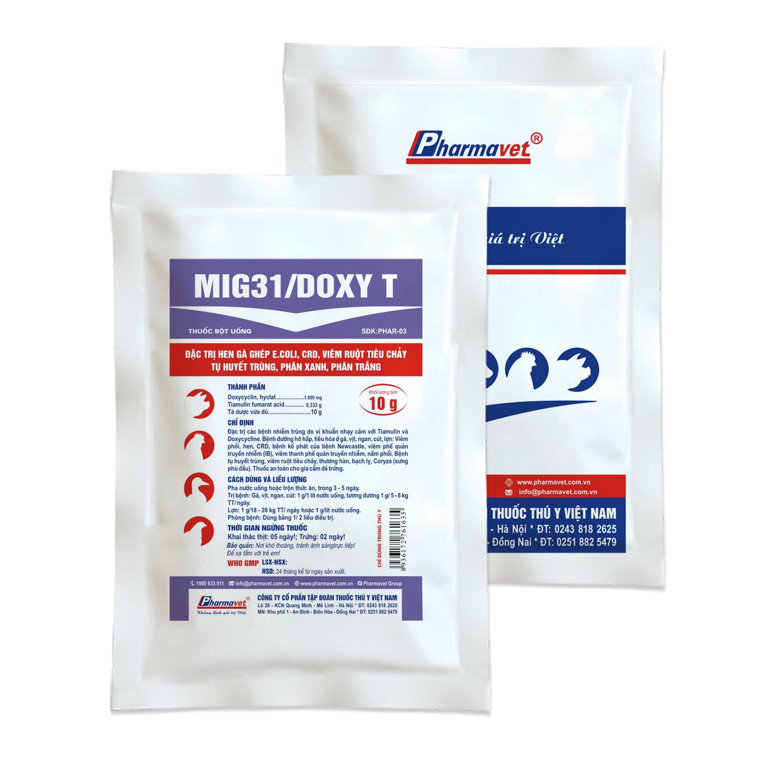 Đặc trị các bệnh nhiễm trùng do vi khuẩn nhạy cảm vối Tiamulin và Doxycyline. Bệnh đường hô hấp, tiêu hóa ở gà, vịt, ngan, cút, lợn: Viêm phổi, hen, CRD, bệnh kế phát của bệnh Newcastle, viêm phế quản truyền nhiễm (IB), viêm thanh phế quản truyền nhiễm, nấm phổi. Bệnh tụ huyết trùng, viêm ruột tiêu chảy, thương hàn, bạch lỵ, Coryza (sưng phù đầu).